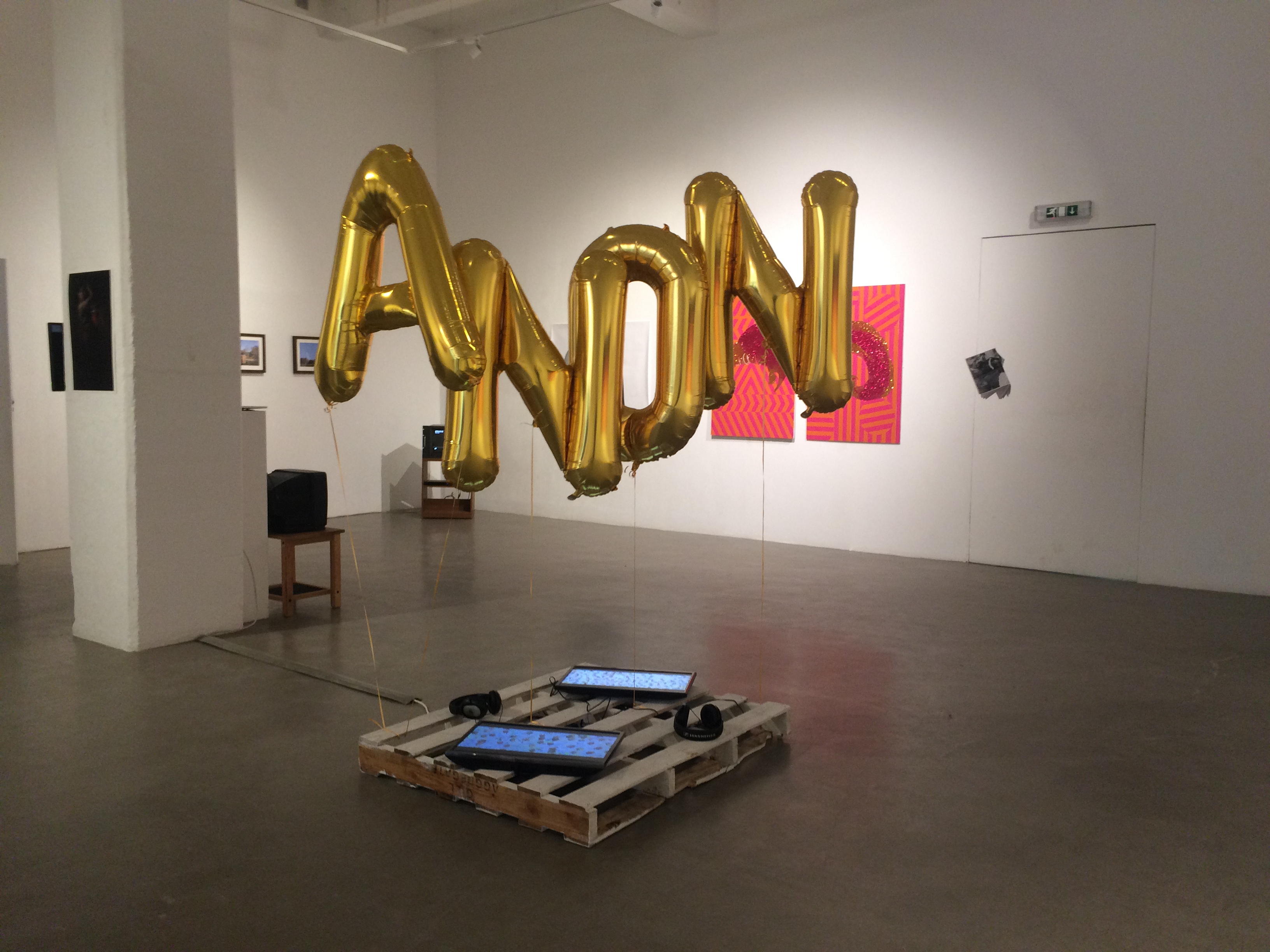 HELIUM BALLOONS, WOODEN PALLET, LCD MONITORS.